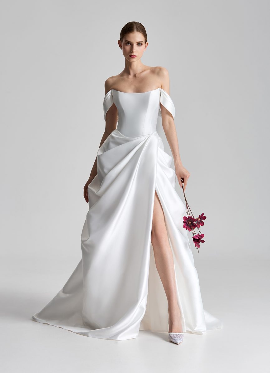 Атласные платья идеально подходят для вечерних свадеб, роскошных залов и фотосессий с мягким светом – ткань буквально сияет на снимках.