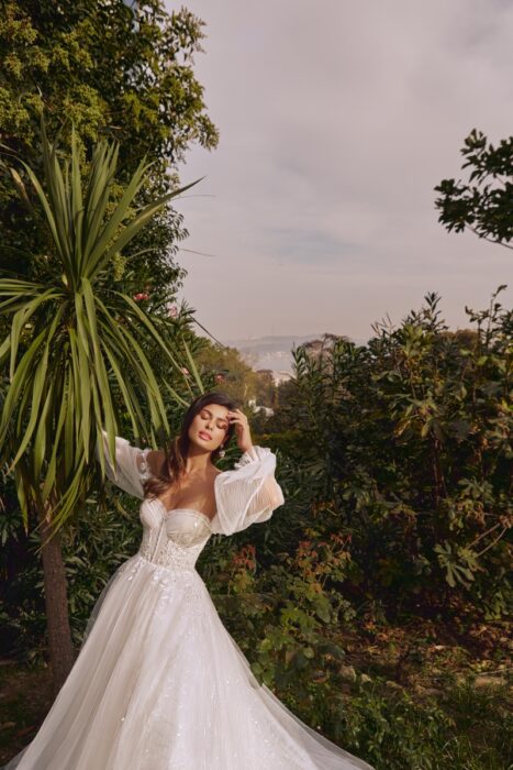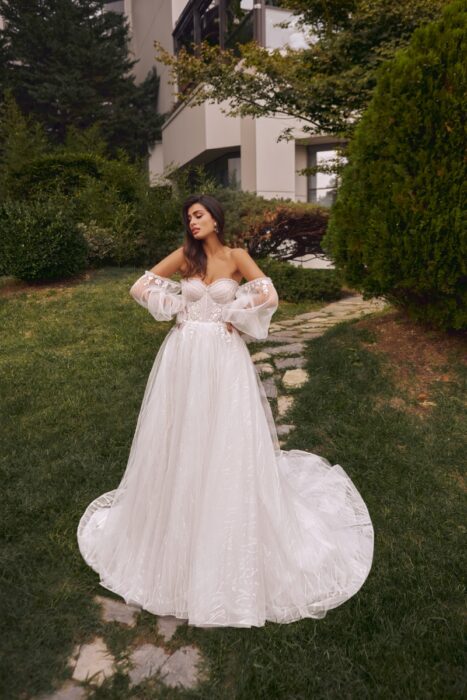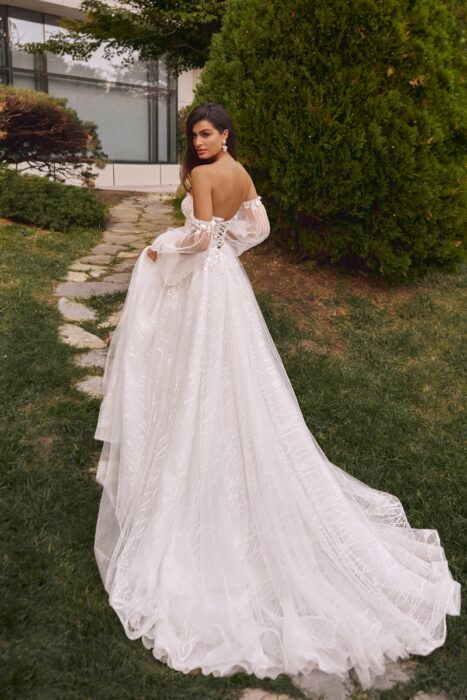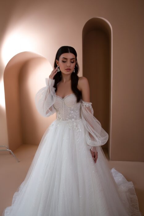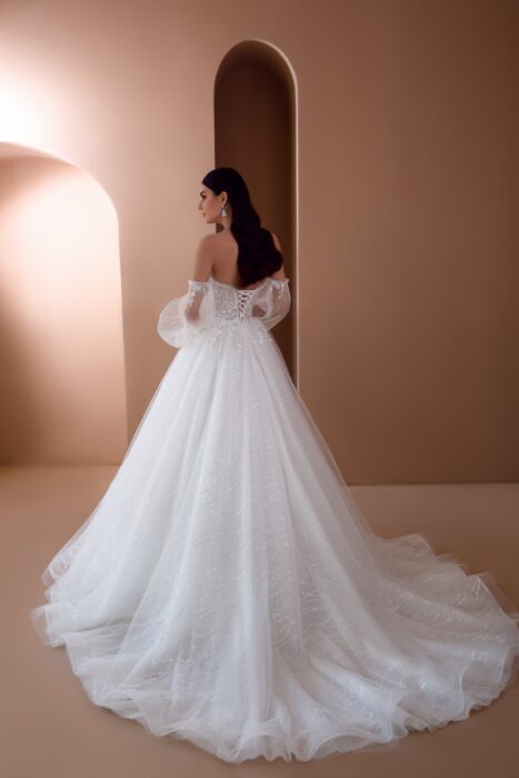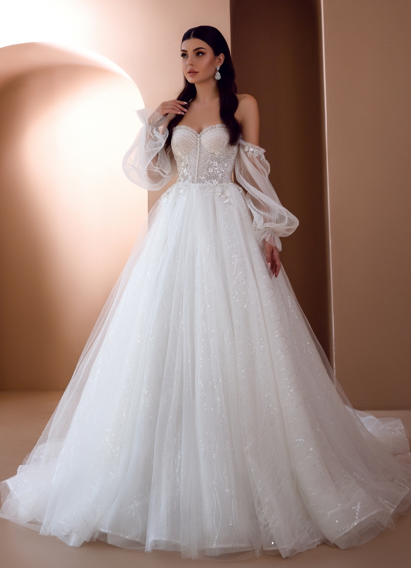 Открытые плечи добавляют легкости и чувственности, а воздушные рукава создают утонченный и трендовый акцент. Длинный шлейф делает платье королевским и придает походке особое величие.