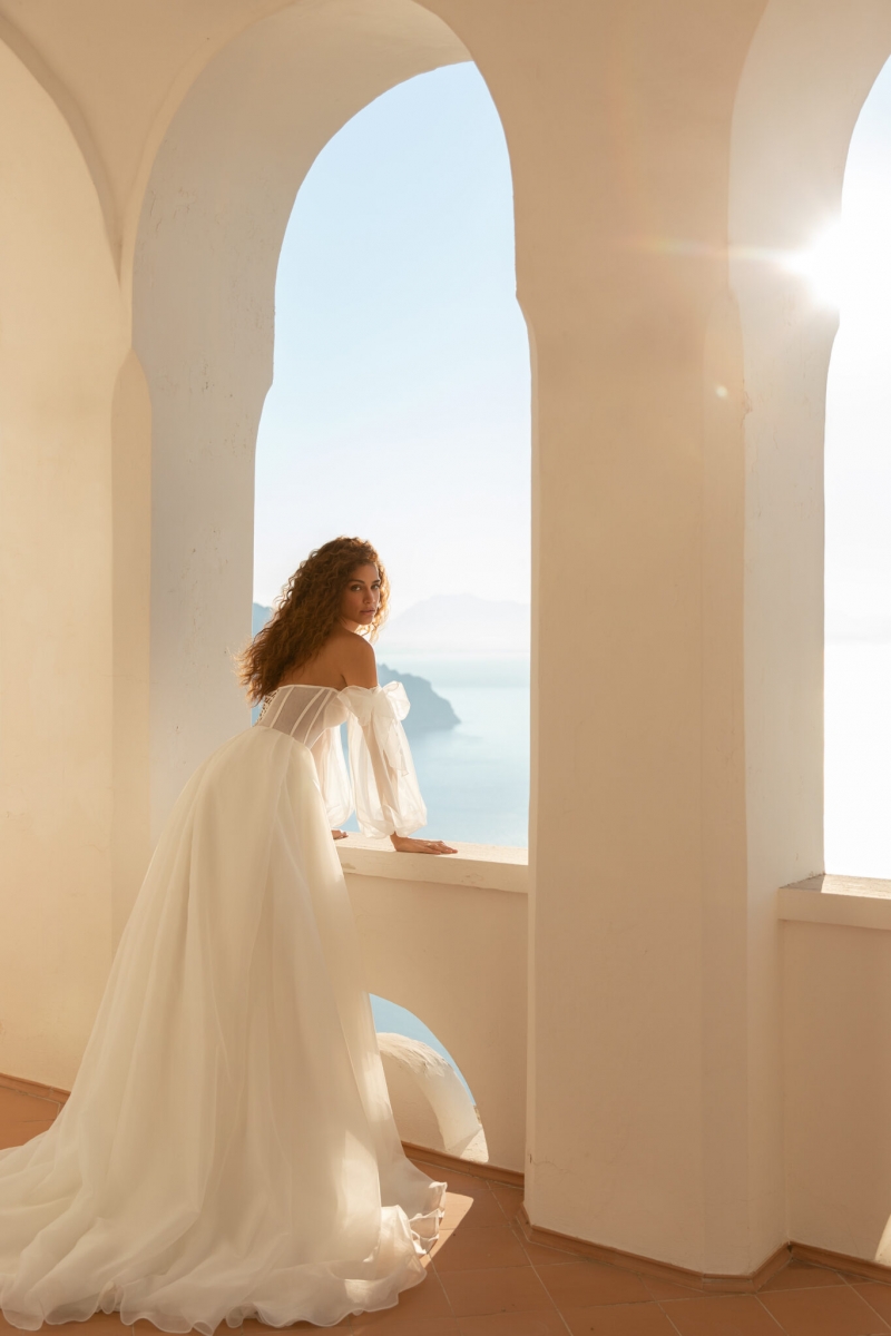 Открытые плечи и деликатные рукава создают элегантную линию декольте и придают образу нежность. Акцентный разрез на юбке добавляет платью динамики и легкой дерзости, позволяя продемонстрировать изящные ноги и красивые свадебные туфли.