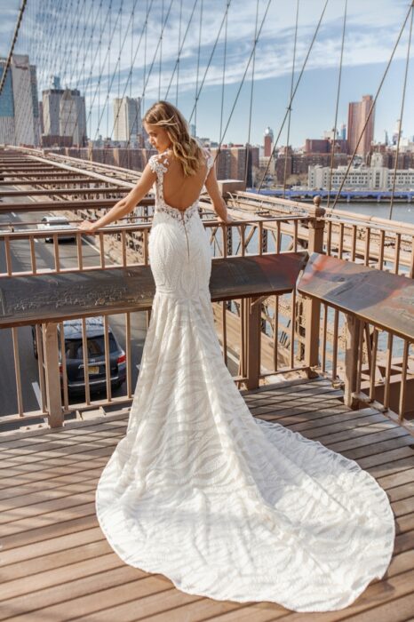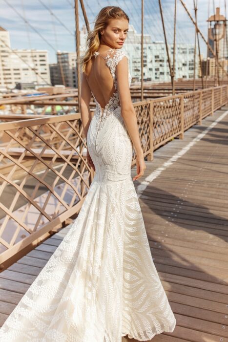 Открытая спина придает наряду особую легкость и утонченную смелость, а воздушный длинный шлейф делает ваш выход по-настоящему торжественным. Каждая деталь платья продумана, чтобы вы чувствовали себя уверенно и роскошно в течение всего дня.