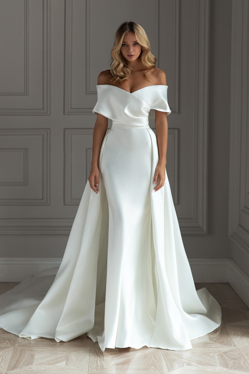 Эффектное свадебное платье-трансформер из атласа с открытыми плечами и длинным шлейфом