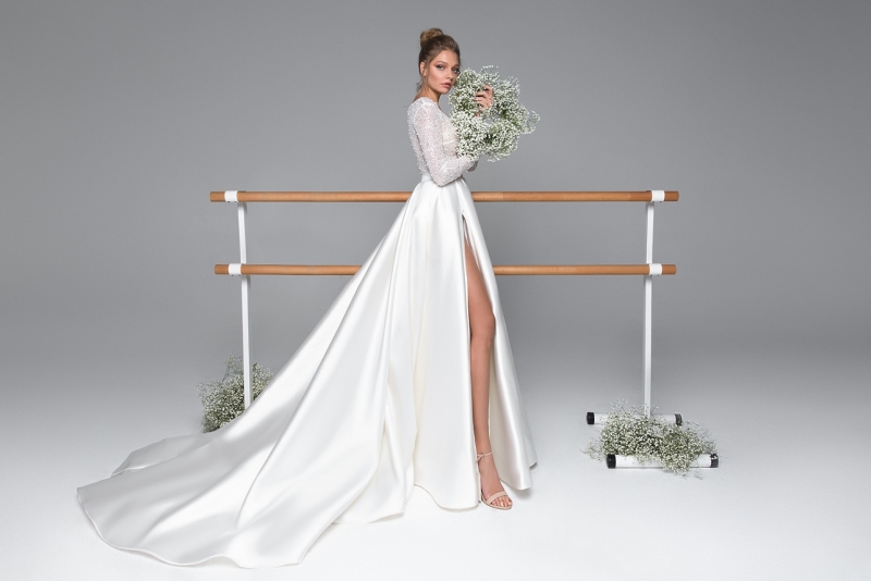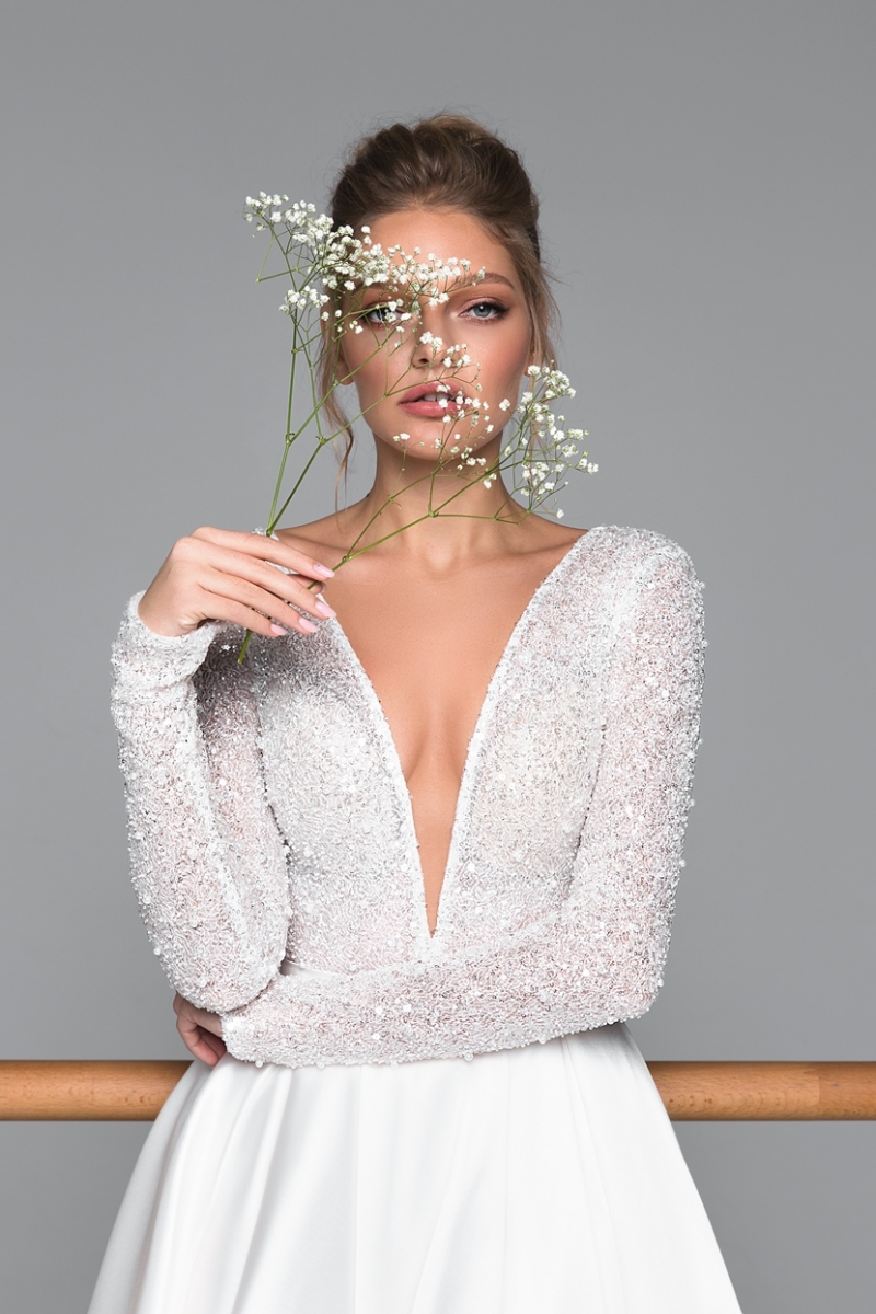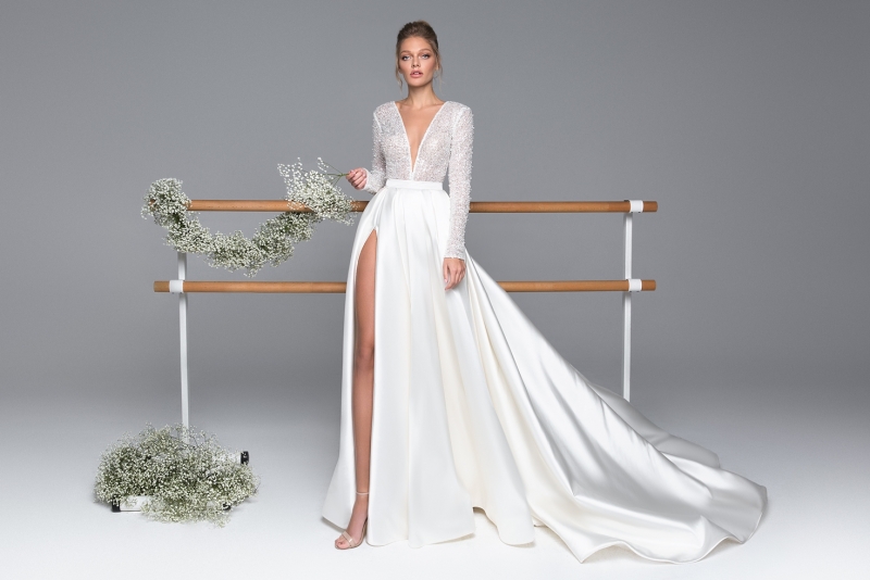 Изысканное сочетание элегантности и дерзкого шарма — модель “Kylie” — это свадебное платье А-силуэта в атласном исполнении создано для невест, которые мечтают выглядеть по-настоящему эффектно. Глубокий V-вырез, изящные длинные рукава и смелый разрез до бедра подчеркивают фигуру и придают образу чувственности и утонченности.
