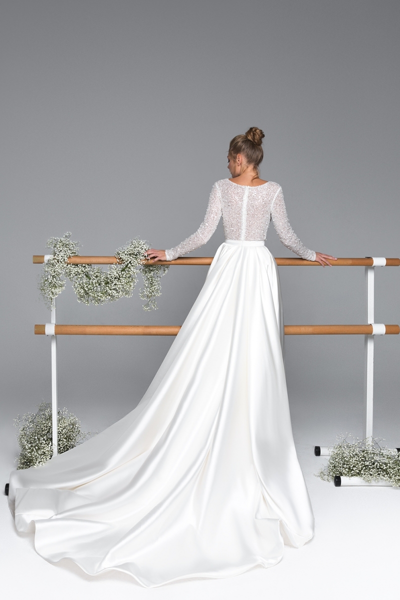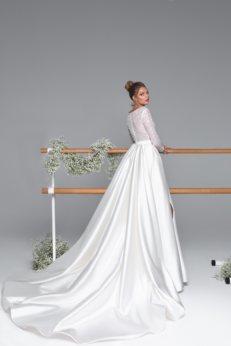 Блестящий верх, расшитый пайетками, красиво контрастирует с матовым атласом юбки, создавая гармоничный и праздничный образ. Плавно ниспадающий шлейф придает походке грацию, а силуэт «принцессы» подчеркивает талию и визуально удлиняет ноги.
