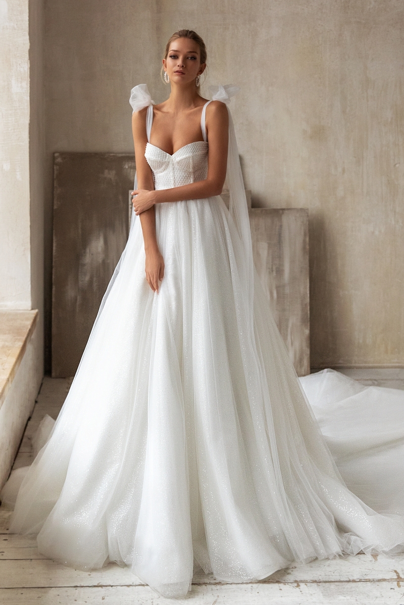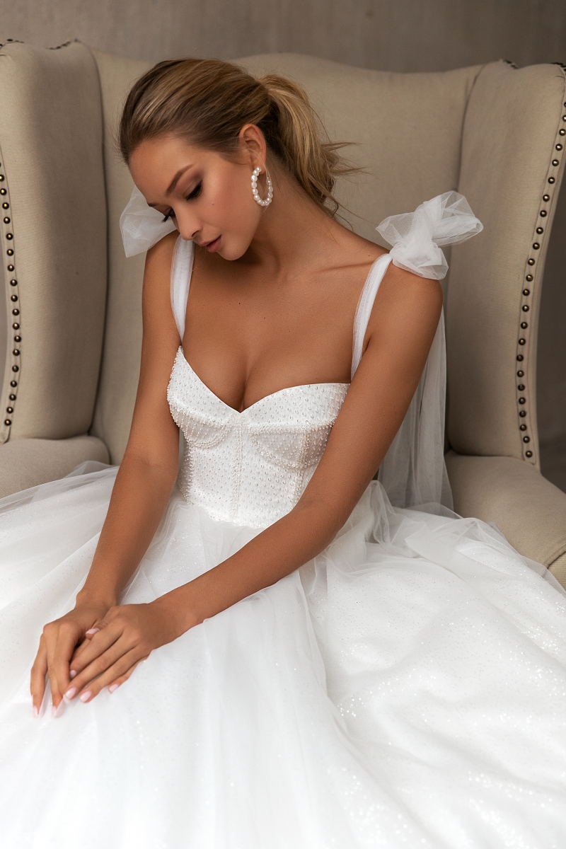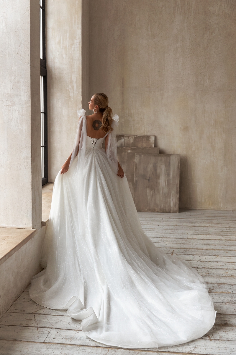 Особое внимание заслуживает корсет — он идеально подчеркивает талию, формируя изящный силуэт и обеспечивая безупречную посадку. А открытые плечи придают образу романтичную утонченность и женственность. Завершает эту королевскую композицию элегантный длинный шлейф, который делает походку торжественной и грациозной.