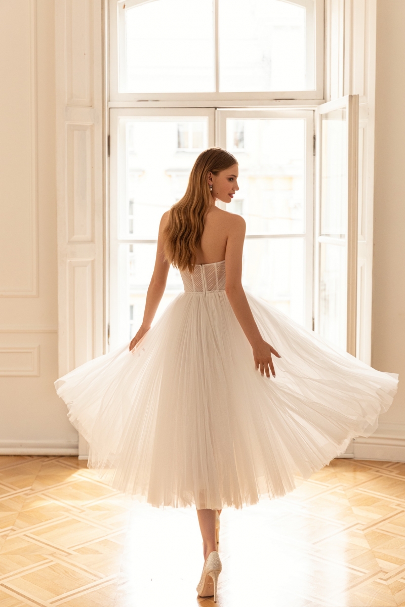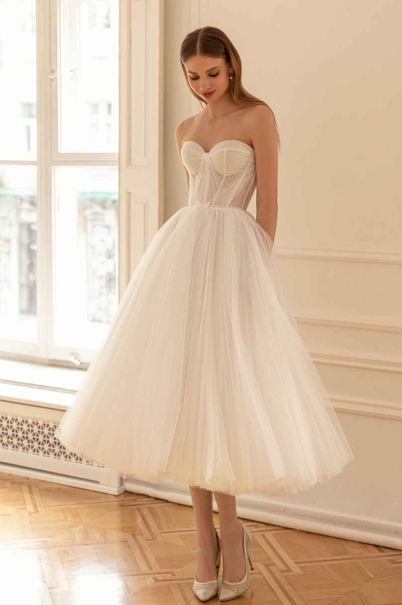 Короткое свадебное платье с пышной юбкой — классический выбор для невест, мечтающих о романтическом и волшебном образе в день своей свадьбы. Такое платье не только подчеркивает фигуру, но и создает эффектный силуэт, который привлекает внимание и вызывает восхищение. В модели “Molly” соединились воедино необычная длина-миди, многослойная фатиновая юбка и шикарный корсет с открытыми плечами. Обо всем по порядку: