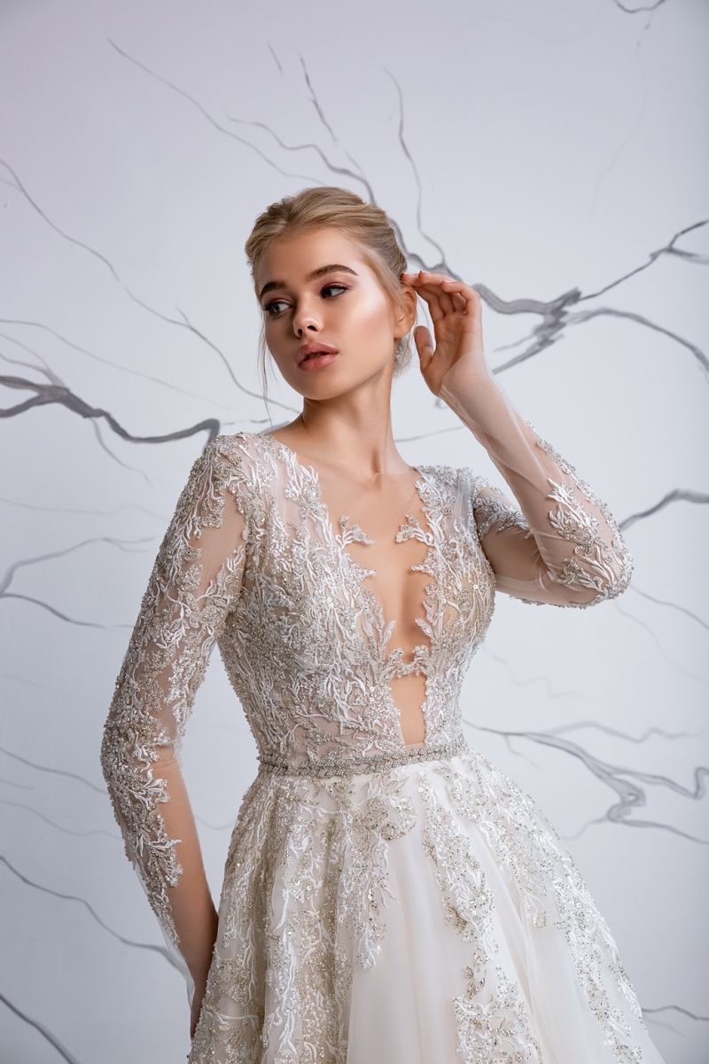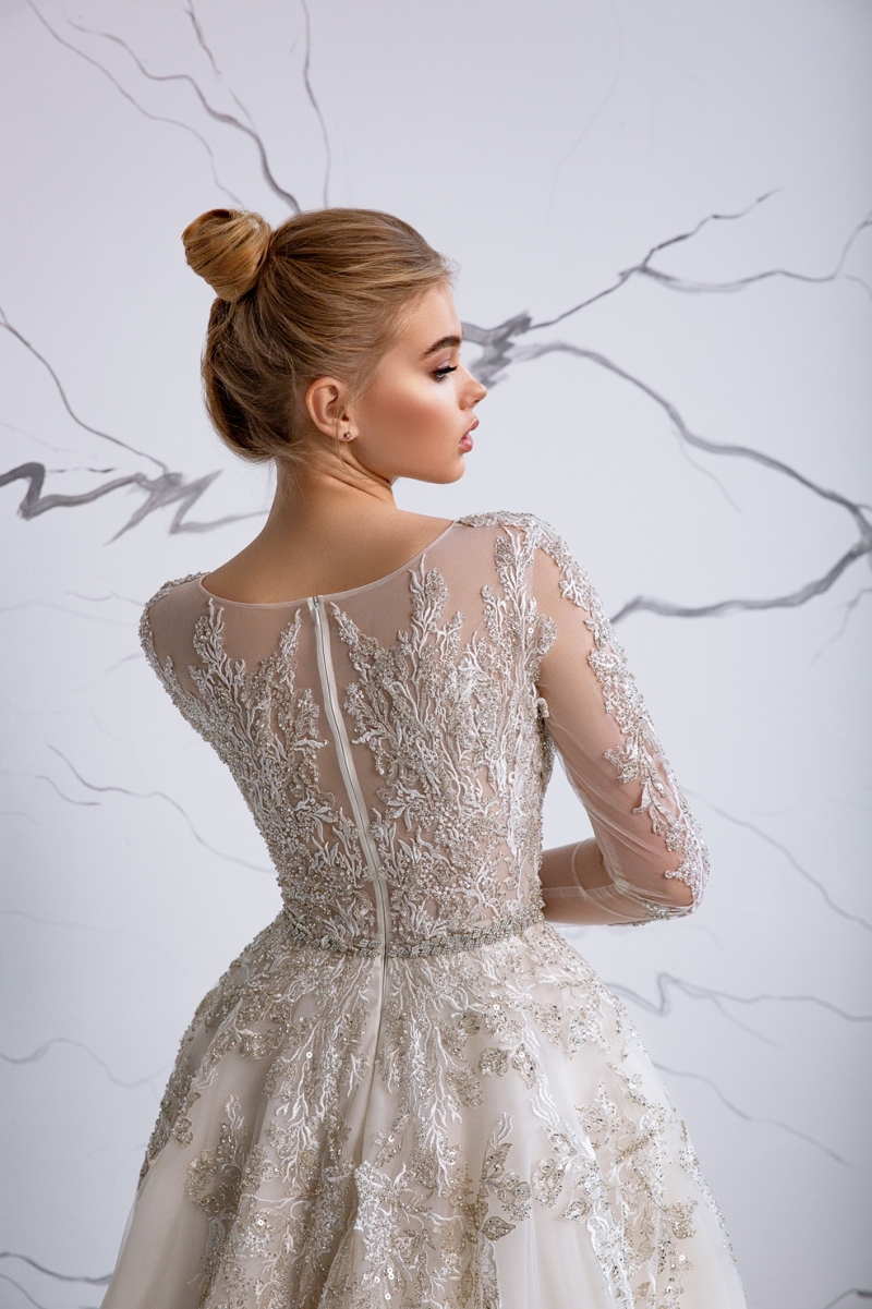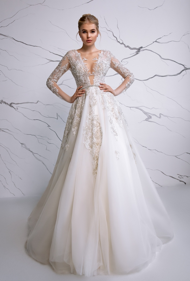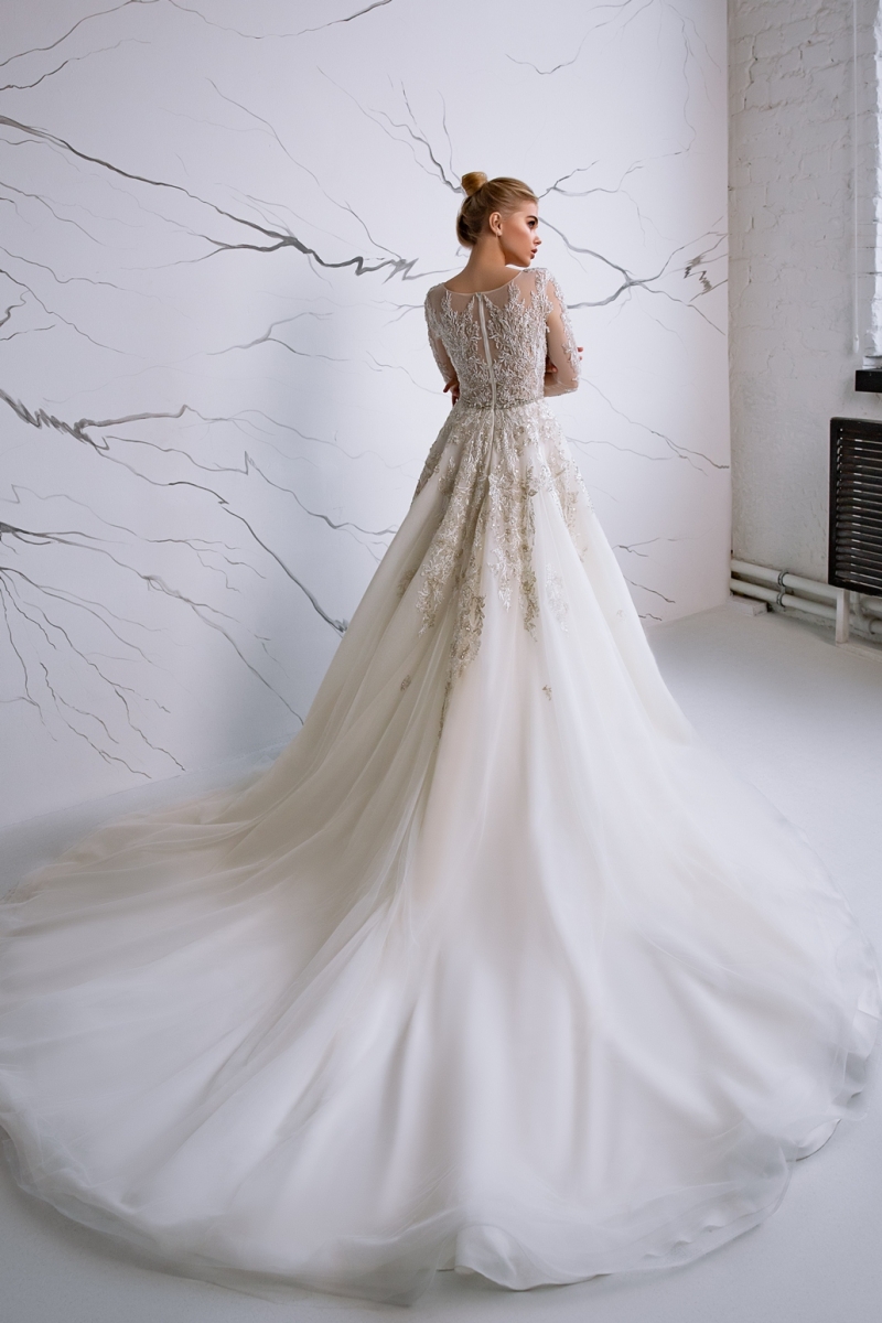 Если вы мечтаете выйти замуж в образе настоящей принцессы, это платье создано именно для вас. Модель “Pepper” – роскошное сказочное свадебное платье в А-силуэте покоряет с первого взгляда: легкие фатиновые слои, изысканное кружевное оформление, изящные рукава и по-настоящему очень длинный шлейф — все это создает волшебную атмосферу.
