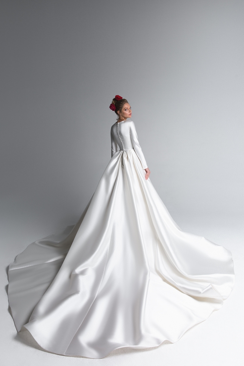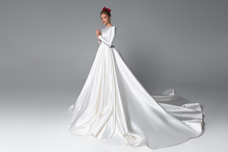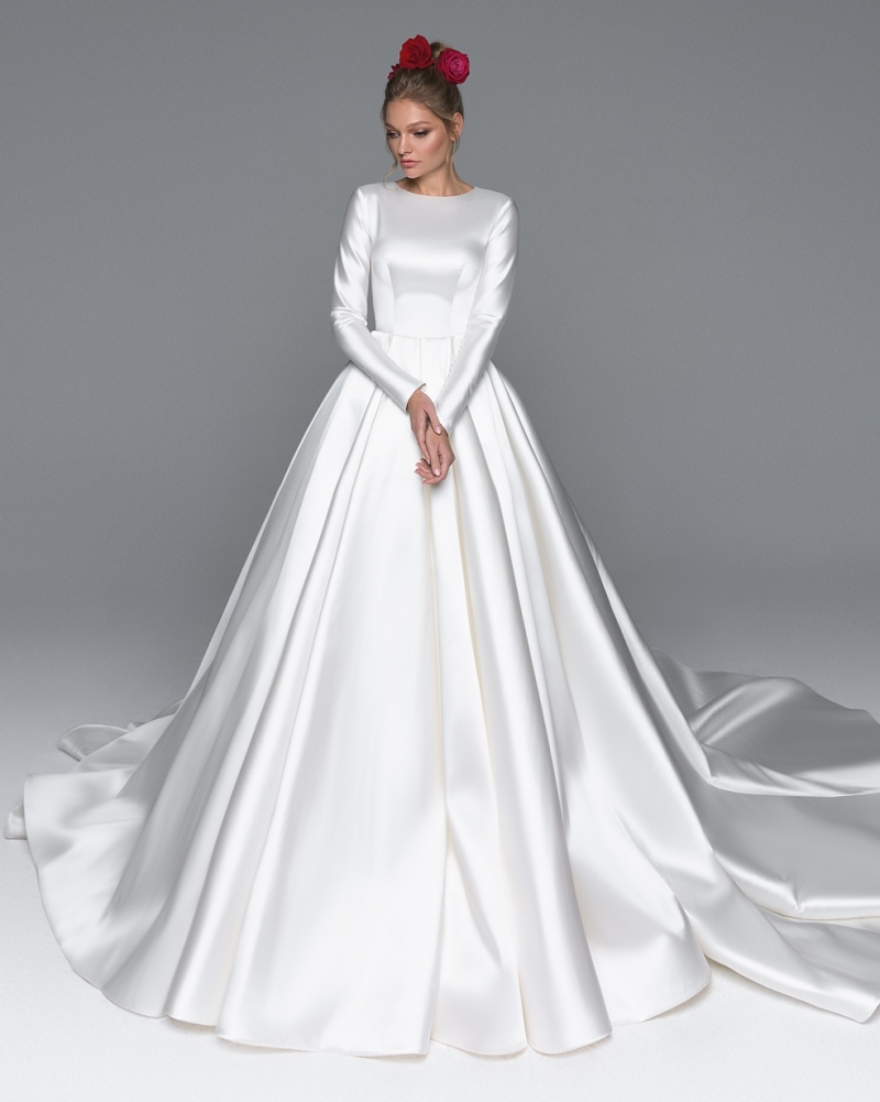 Элегантное закрытое свадебное платье из атласа с рукавами и шлейфом