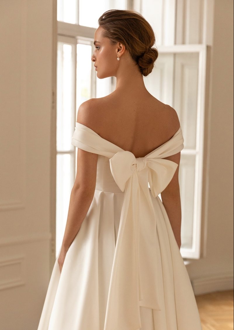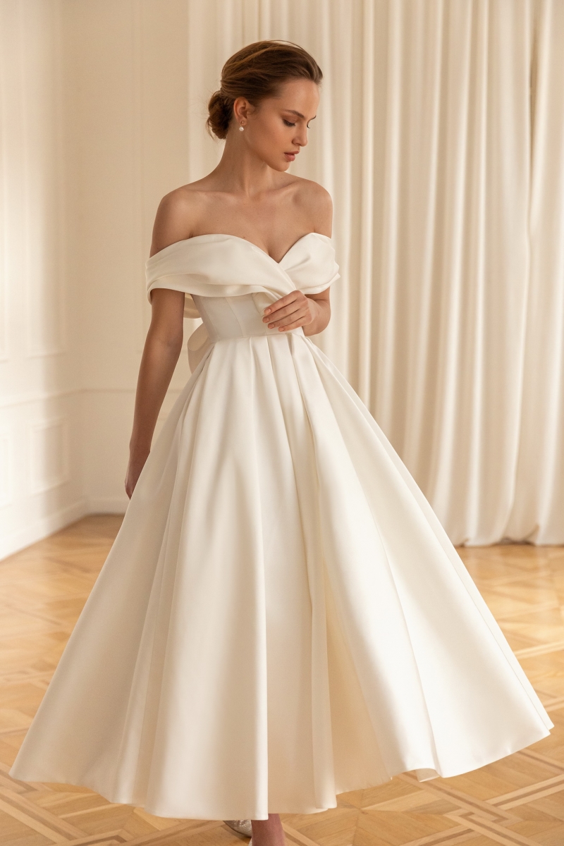 Ну а если серьезно, короткое свадебное платье уже несколько лет держится в тренде, а актуальная длина “миди” и вовсе рвет рейтинги каталогов и салонов. Модель “Sweet” обладает не только желанной длиной, но и удачным запоминающимся фасоном. Пышная (но не многослойная) юбка из тяжелого премиального атласа формирует кукольный а-силуэт, подчеркивая тонкость талии и изящность плеч и линии шеи. Бант на спине добавляет образу женственности, нежности, милоты.