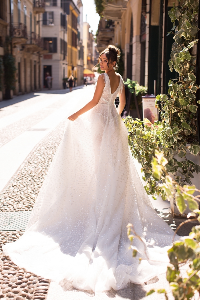 Модель “Denila” станет отличным выбором для торжества любого масштаба. Благодаря комбинации кружевных элементов и сияющих деталей, платье смотрится особенно изысканно на фото и подчёркивает утончённость фигуры. Длинный шлейф добавит вашему выходу драматичности и сделает его по-настоящему эффектным.