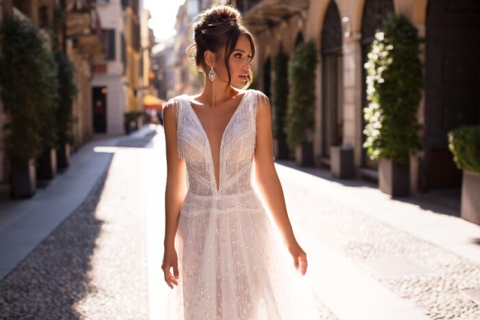 Ищете наряд, который станет воплощением роскоши и романтики? Платье “Denila” из коллекции Giovanna Alessandro – это кружевное свадебное платье с изящным блеском, которое покоряет с первого взгляда. Его утонченное кружево, переливающееся при свете, создает волшебный эффект, а изящный шлейф придает образу торжественность и величие. Такой наряд идеально подойдет для невесты, которая мечтает о по-настоящему ярком и запоминающемся образе.