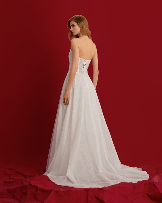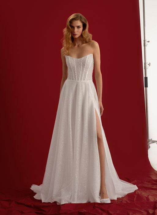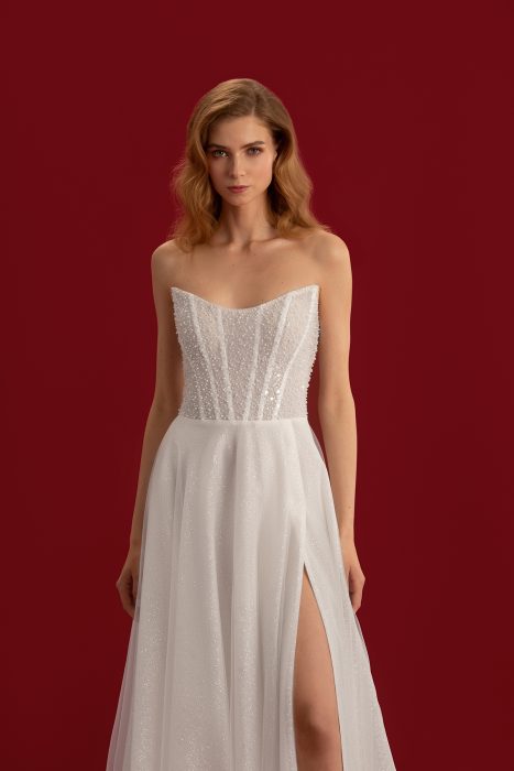 Перед вами великолепное свадебное платье А-силуэта “Чинция”, которое стало воплощением изящества и утонченности. Облегающий корсет обрамляет стройную талию, подчеркнув все достоинства фигуры, а блестящие элементы идеально переливаются на свету, придавая образу нотки волшебства и романтики.