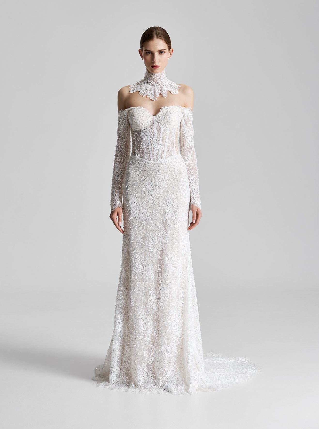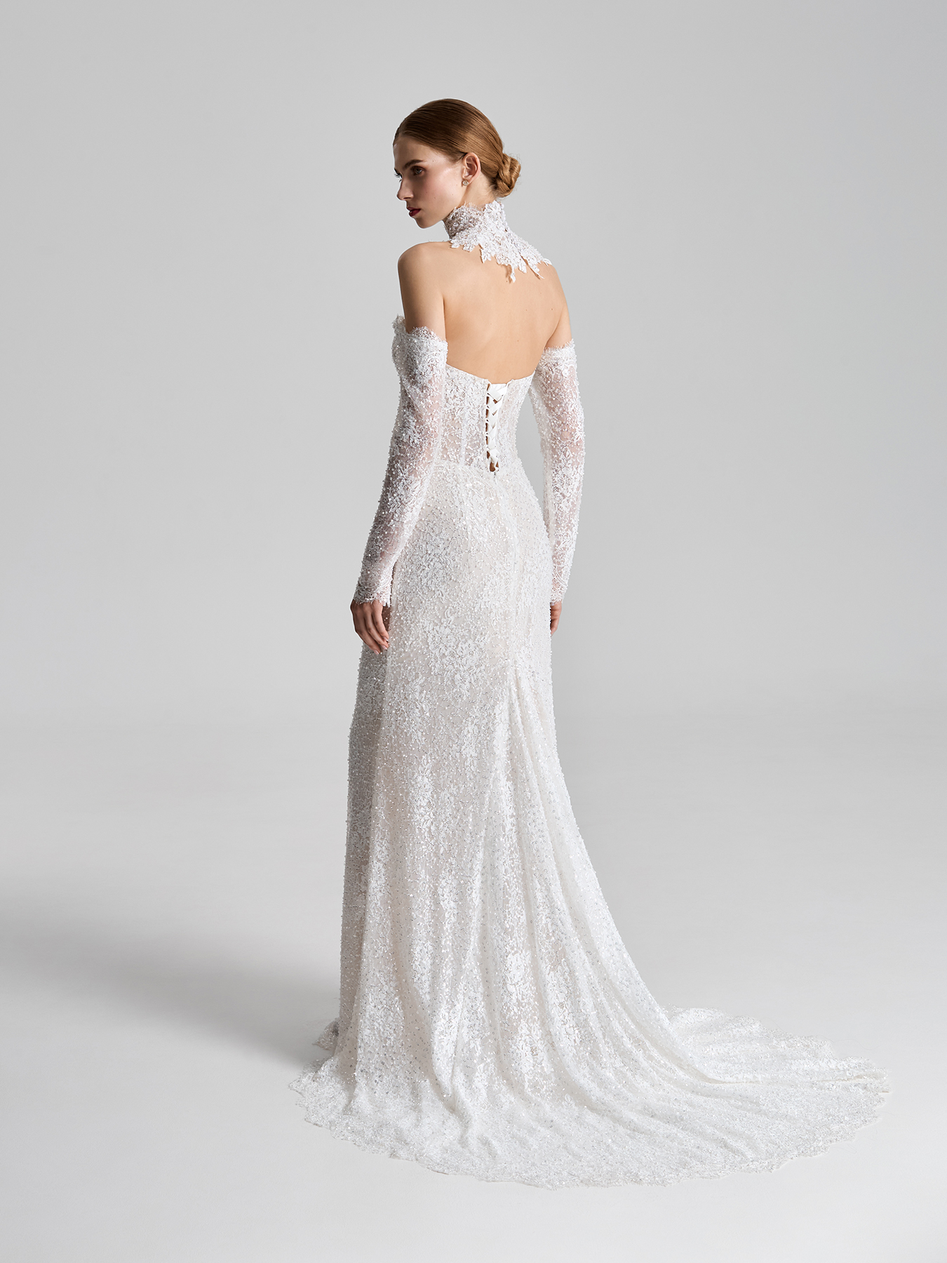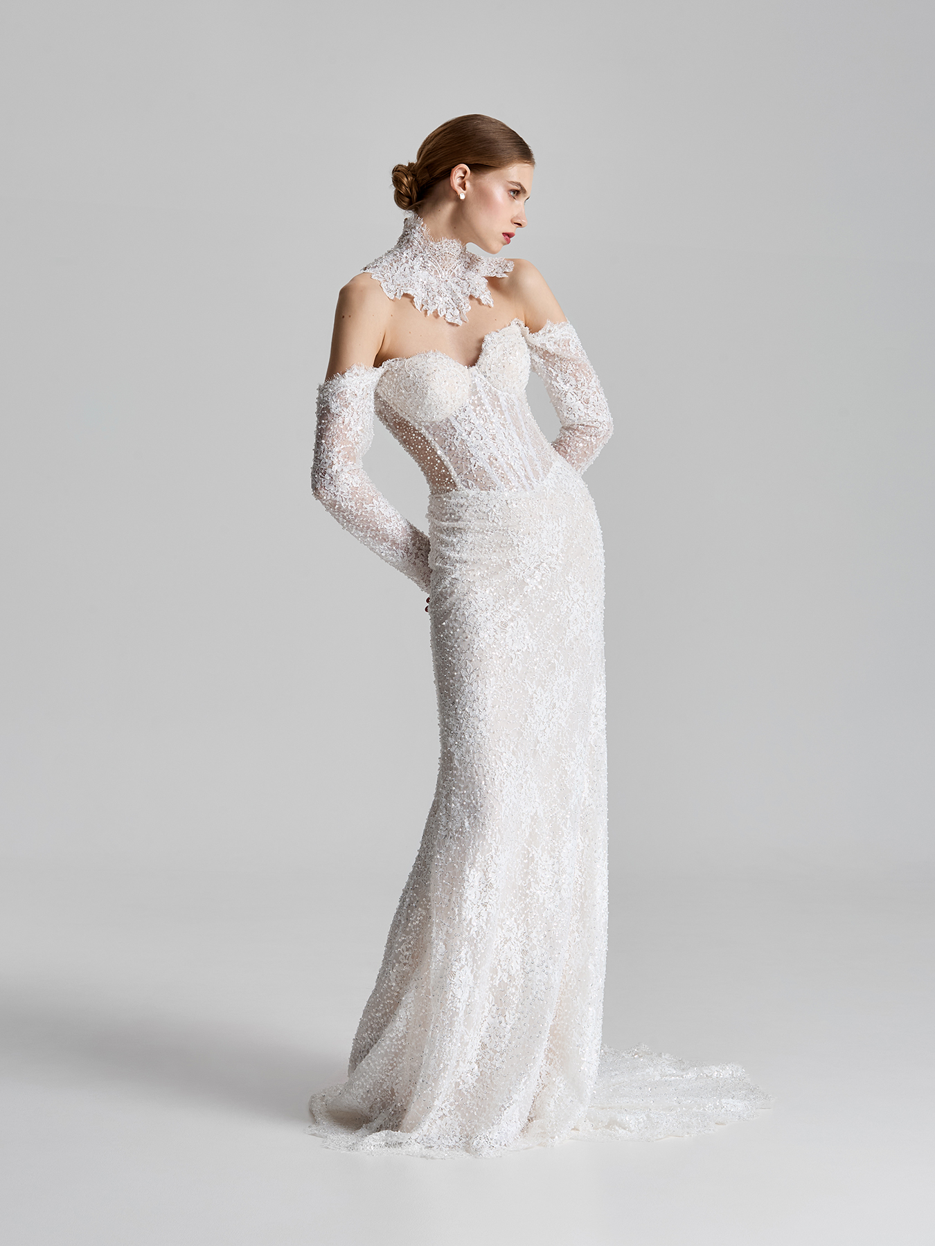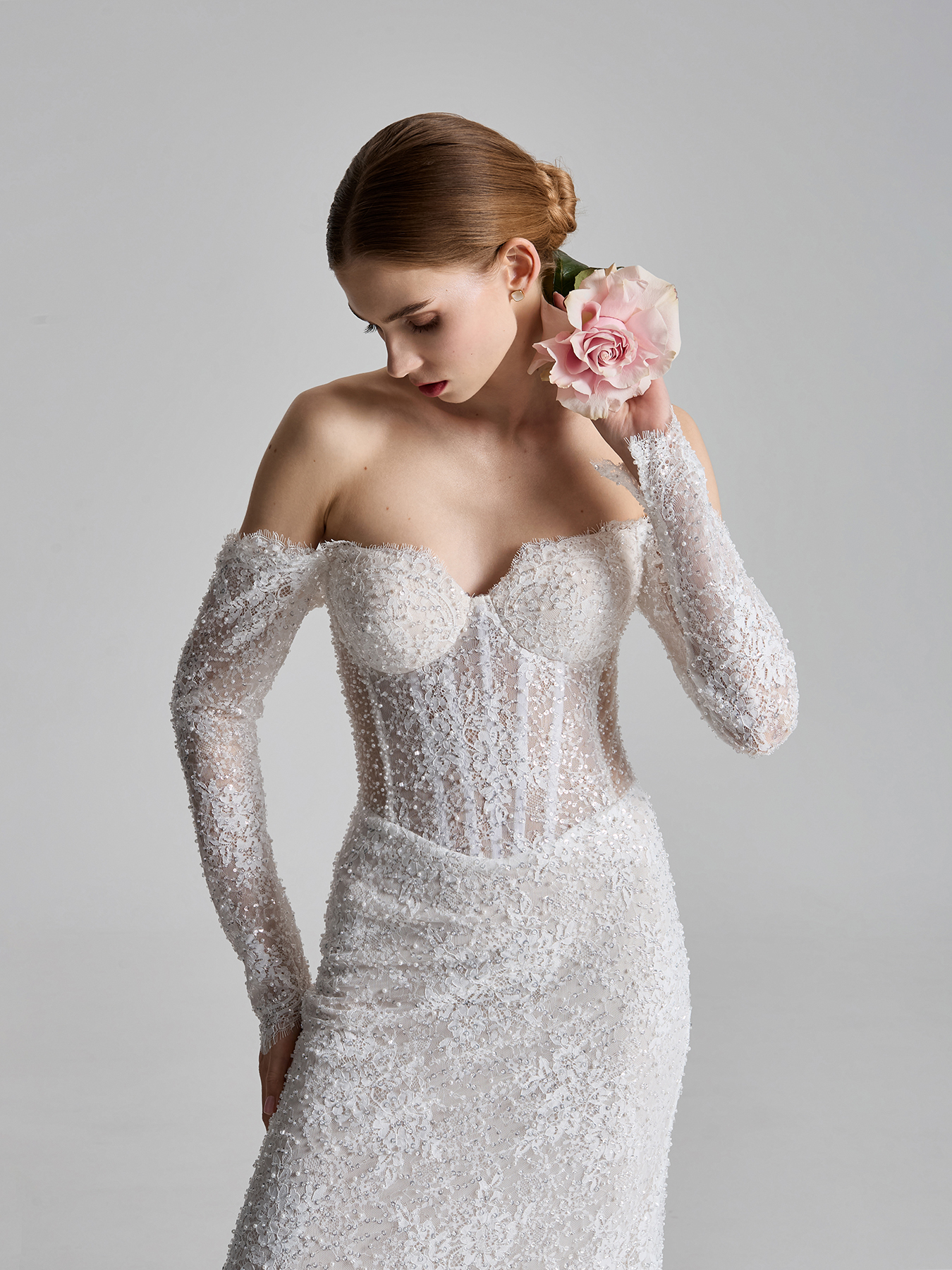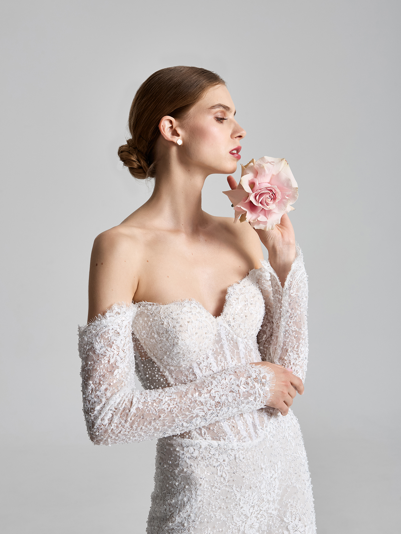 Свадебное платье “Далида” — сочетание элегантности и романтики. Его нежный силуэт по фигуре подчеркивает все изгибы тела, создавая безупречный образ невесты. Корсет, искусно декорированный кружевом, придает платью особую строгость и изящество, обрамляя грудь и подчеркивая талию.