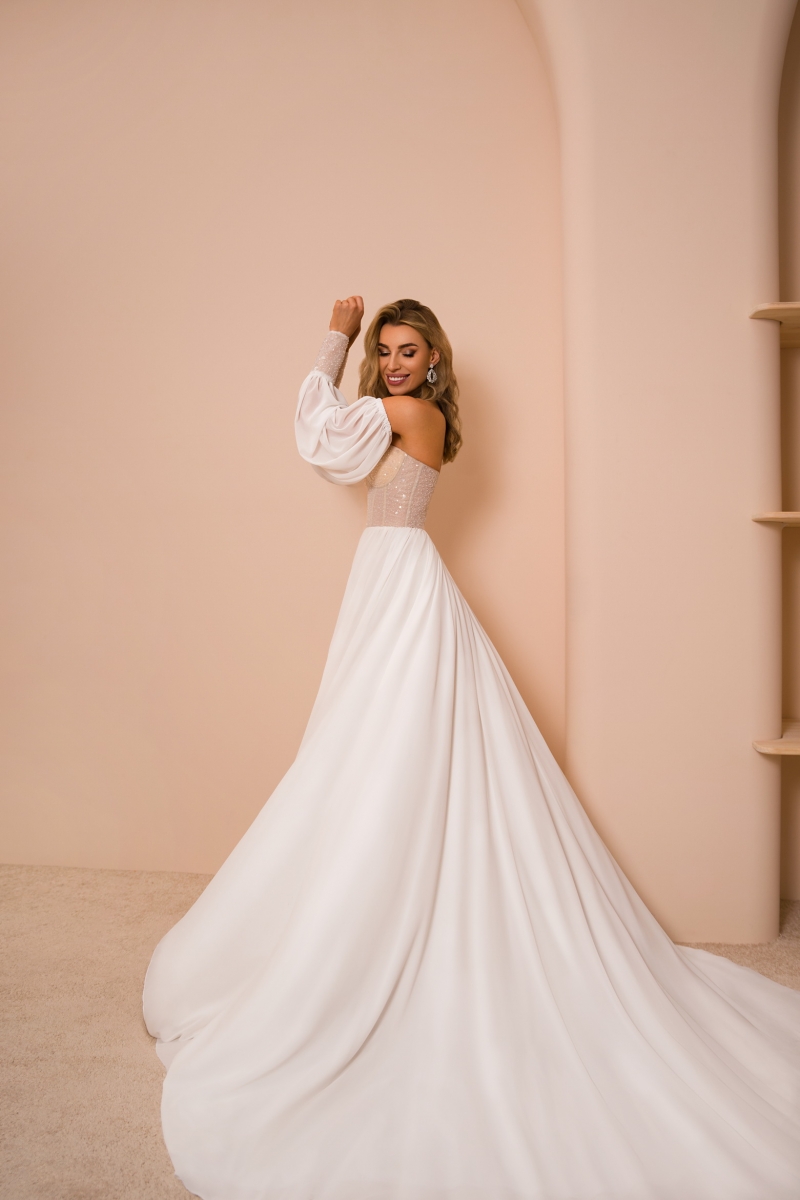 Melody — это платье, которое заставляет сердце биться чаще с первого взгляда. Оно создано для невесты, мечтающей о величественном, но при этом женственном и легком образе. Корсет идеально подчеркивает фигуру и добавляет шарма, создавая утонченный силуэт. А открытые плечи и длинные рукава придают образу ту самую изысканную элегантность, о которой мечтают невесты по всему миру.