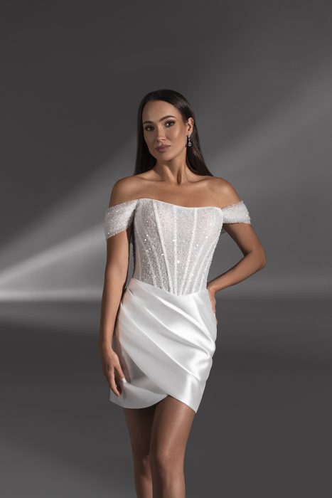 Платье “Mimi” из коллекции “Storia” — это идеальный выбор для современных невест, которые хотят сочетать элегантность и практичность. Легкое, стильное и необычное свадебное платье трансформер выполнено из роскошного атласа в А-силуэте. Оно оснащено удобным корсетом, который эффектно подчеркивает талию, а открытые плечи добавляют образу романтичности и утонченности. Изюминка модели — съемная юбка со шлейфом, позволяющая за считанные секунды превратить торжественный образ в легкий и кокетливый.