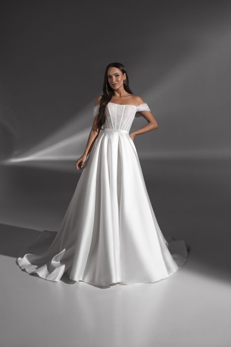 Если вы хотите купить свадебное платье с открытыми плечами и при этом сохранить свободу движения и возможность сменить стиль в течение дня — модель “Mimi” станет настоящей находкой. Такой вариант идеально подойдет как для официальной церемонии, так и для вечерней части праздника.