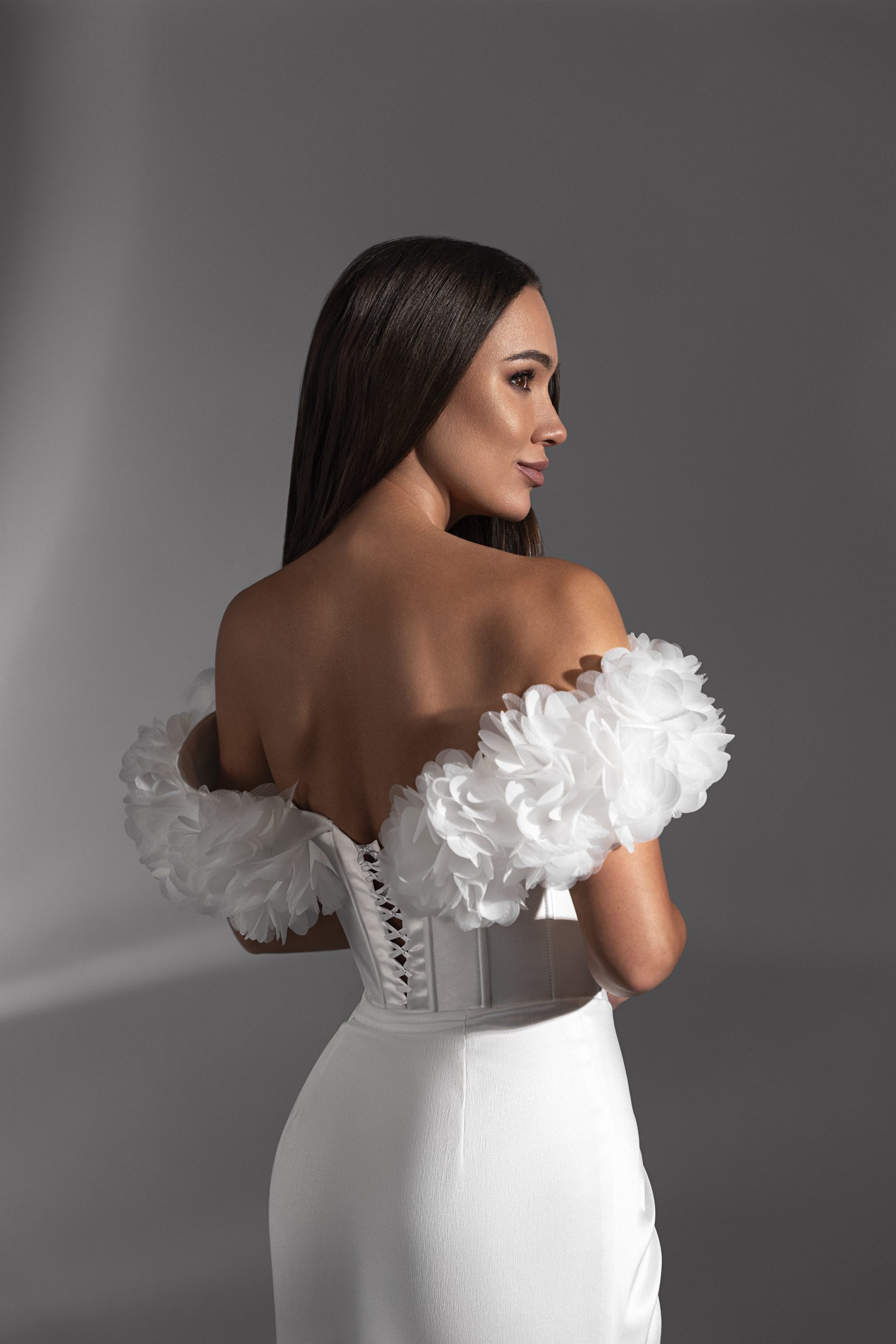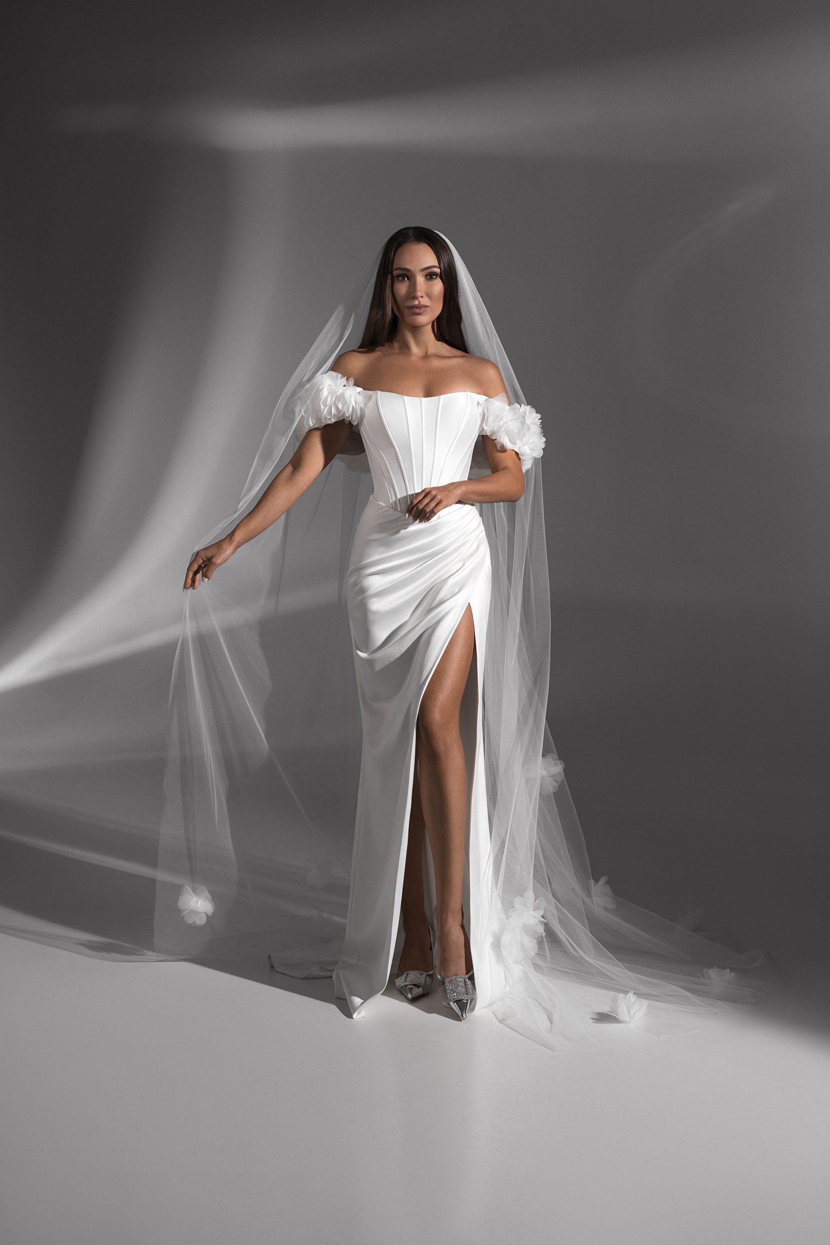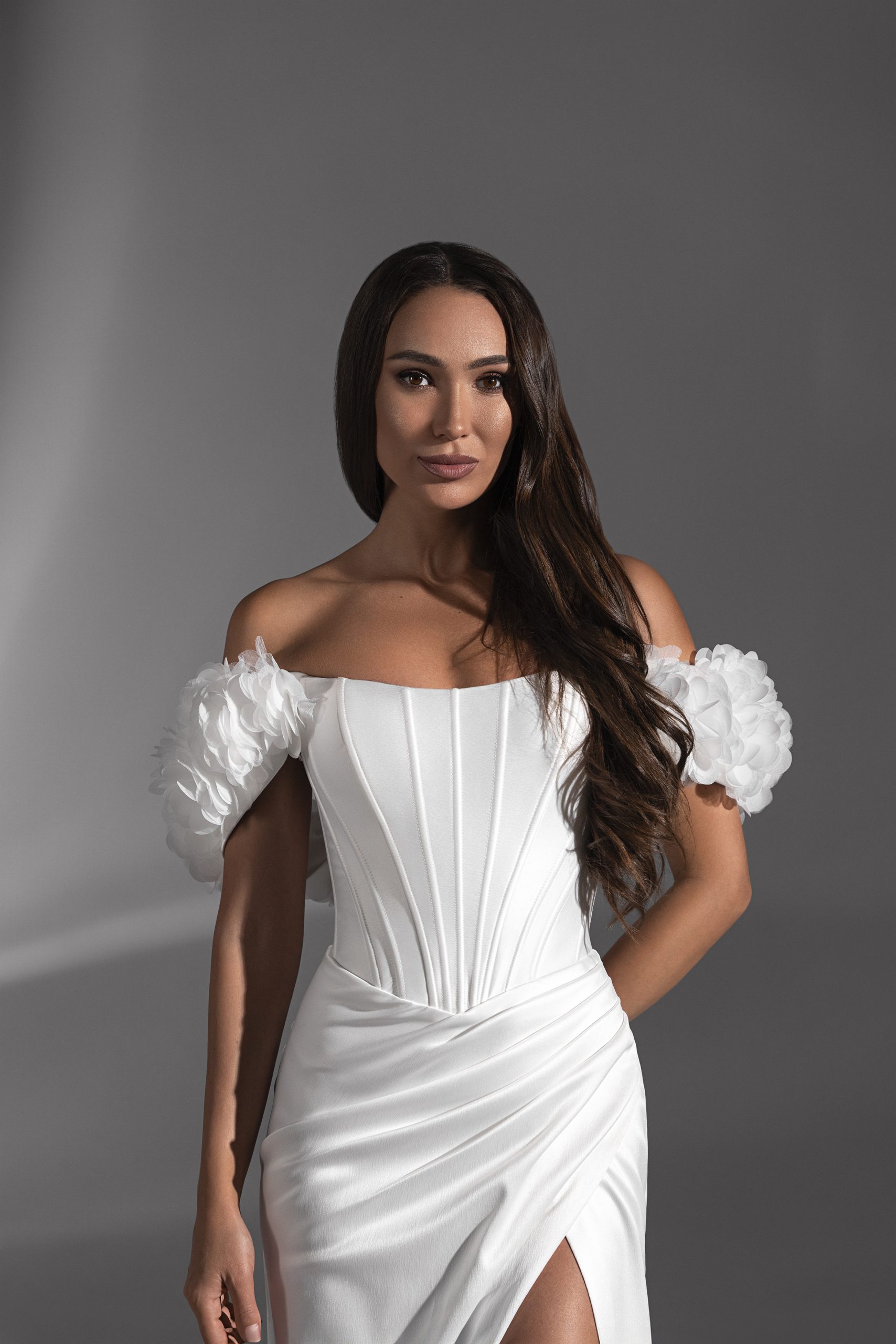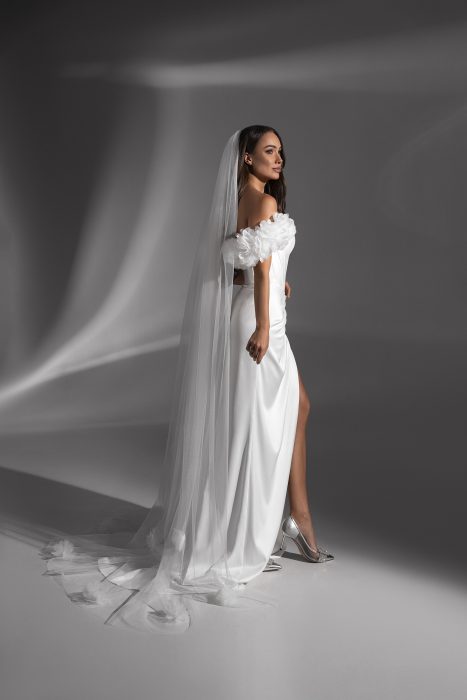 Если вы мечтаете о стильном и эффектном образе, свадебное платье “Pamela” из коллекции “Storia” — идеальный выбор. Элегантный крой по фигуре, изысканный атлас, открытые плечи и соблазнительный разрез делают эту модель настоящим воплощением женственности. Дополняет образ утонченный шлейф, создающий ощущение королевской грации. Корсетная основа платья обеспечивает идеальную посадку и выгодно подчеркивает фигуру.