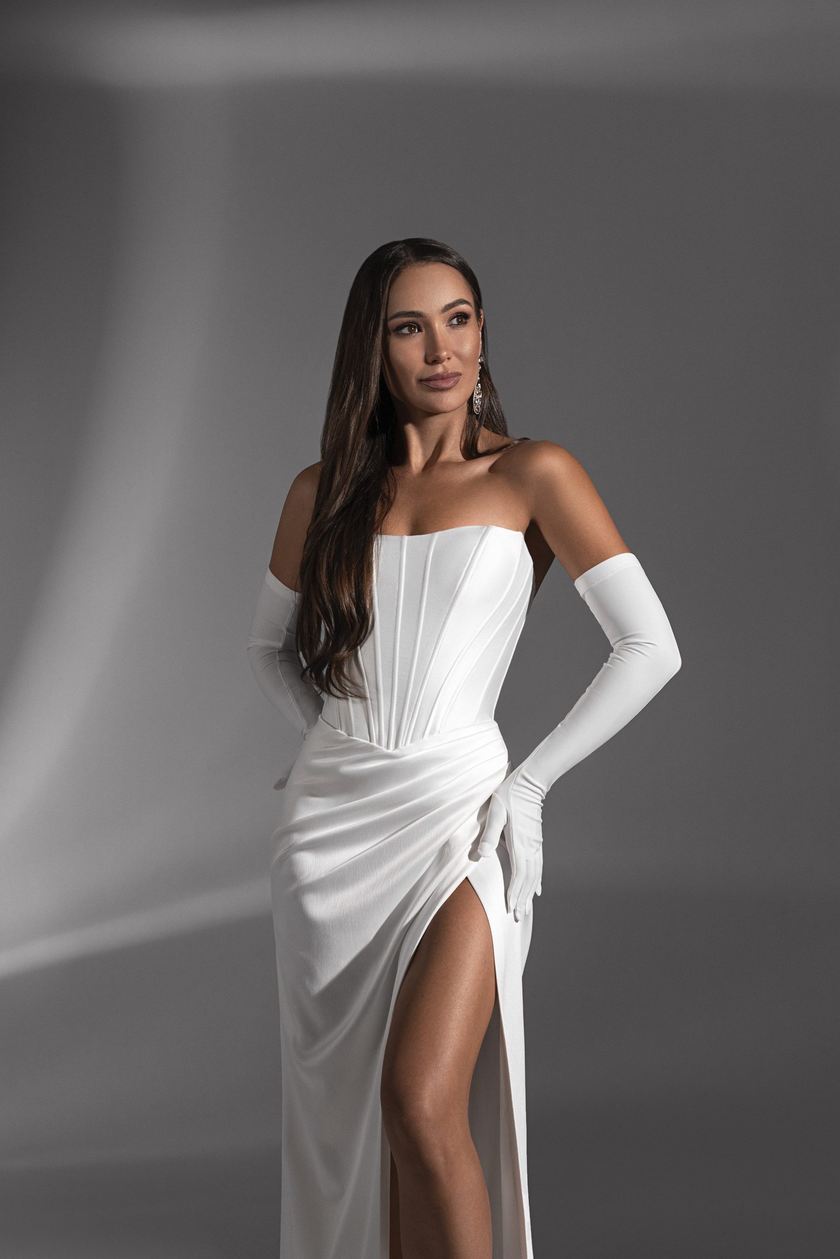 Такой наряд подойдет невестам, которые хотят соединить классику и современность в одном образе. Это свадебное платье с корсетом и разрезом придаёт образу уверенности и динамики, идеально подходит как для торжественной регистрации, так и для стильной фотосессии.