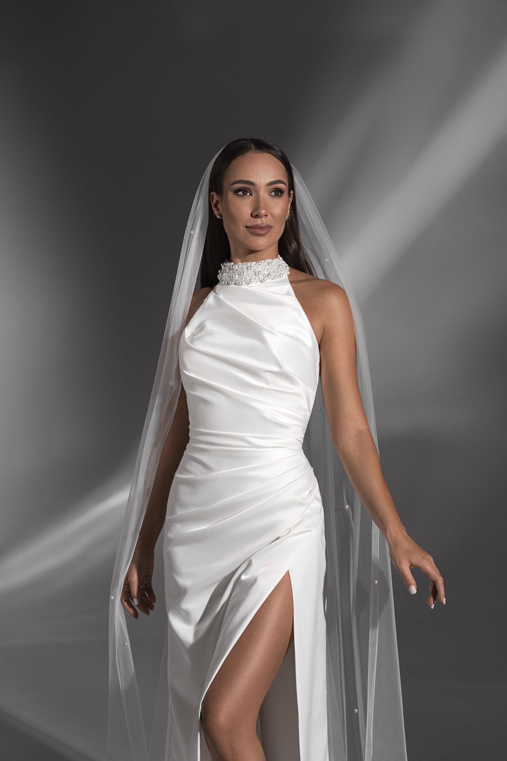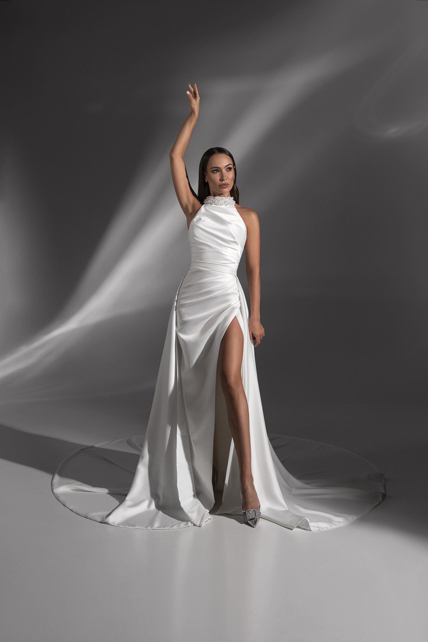 Ищете стильное и запоминающееся свадебное платье? Обратите внимание на модель “Stella” из коллекции “Storia” — элегантное и дерзкое одновременно. Платье выполнено из гладкого атласа, подчеркивает фигуру и идеально садится по силуэту. Открытые плечи, изысканная открытая спина и пикантный разрез делают образ по-настоящему эффектным. Дополняет модель воздушный шлейф, придающий движениям грациозность и легкость.