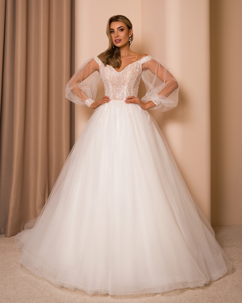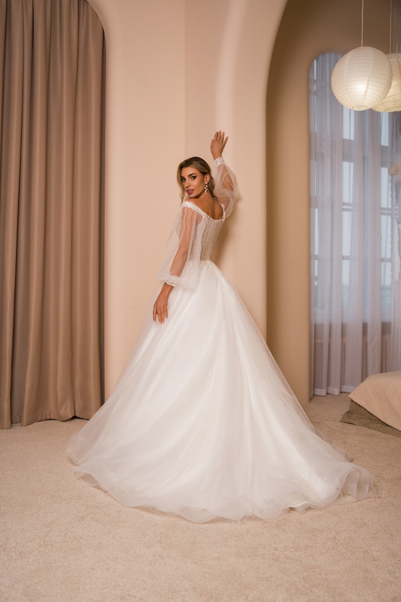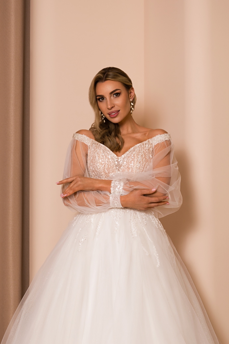 Акцент на открытые плечи делает образ женственным, а легкие рукава добавляют изысканности и создают баланс между классикой и современными тенденциями. Завершающий штрих – королевский шлейф, который плавно скользит за невестой и подчёркивает величие момента.